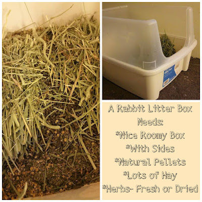 A rabbit’s diet should consist primarily of hay 75-80%, approximately a ball the same size as their body. Since this is hard to regulate, I keep an unlimited supply of hay available at all times. This way they can always snack on hay, which is best for them anyway. I have a larger litter box that I keep full of hay, they can jump into this box, feel like they are hidden, and munch away. I prefer to use Timothy Hay, never alfalfa which is gassy.