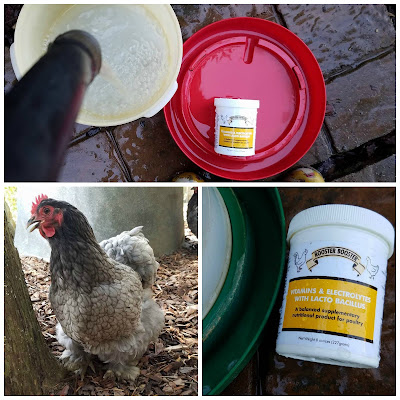 The absolute best way to keep your flock from overheating is to provide a fresh supply of cool water everyday. We attempt to change their waterers several times a day. If the water gets hot, chickens usually just won’t drink it, even in this heat. In addition to the cool water, when we have had long stretches of heat, we like to add vitamins and electrolytes to their water. You can make your own electrolyte mixture or purchase a container. This year, I bought this from Rooster Booster, and it has saved me time, and honestly money. The boost in electrolytes will help them battle the cumulative effects of weeks with extreme temperatures.
