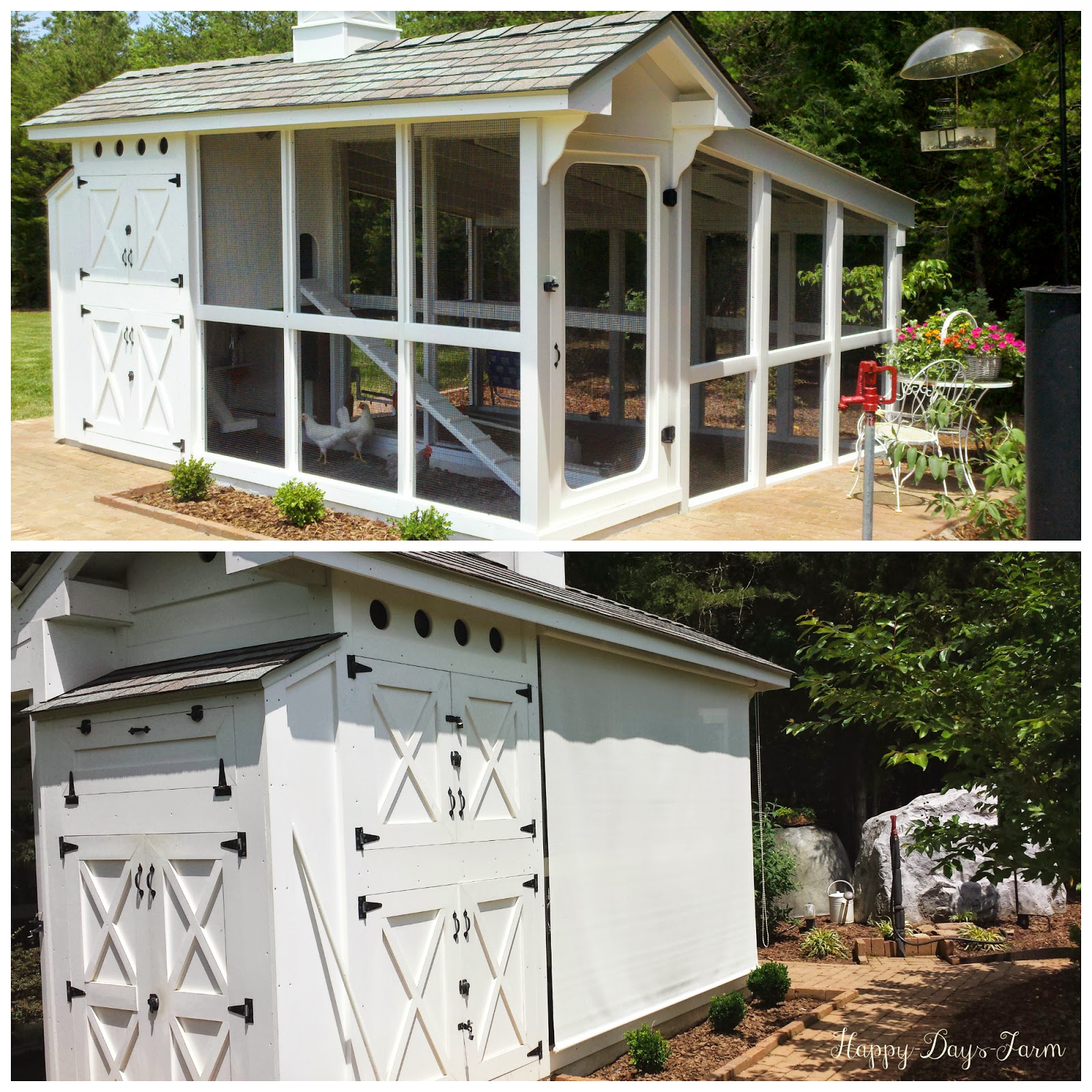 During the hot summer months, especially in the south, flocks have weeks of temperatures that are dangerous for their health. One important thing you can do is provide shade for them. In addition to trees, shrubs, and plants, we installed a sun shade to the front run where the sun beats in the heaviest. This shade has tiny holes covering the entire surface, which allows the breeze to blow through, but stops direct sunlight from coming in.